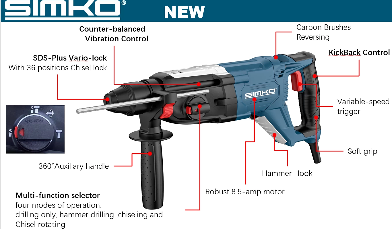 ● Contrôle des vibrations à contrepoids (SR290-28PA/B) – améliore le confort d'utilisation lors des opérations de perçage ou de burinage.