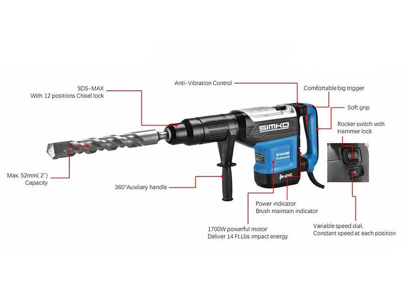 ● Deux modes de réglage : perçage rotatif et percussion seul, avec position de repos.