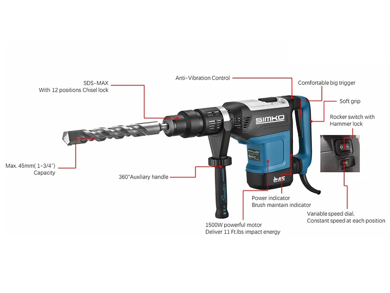 ● Deux modes de réglage : perçage rotatif et percussion seul, avec position de repos.