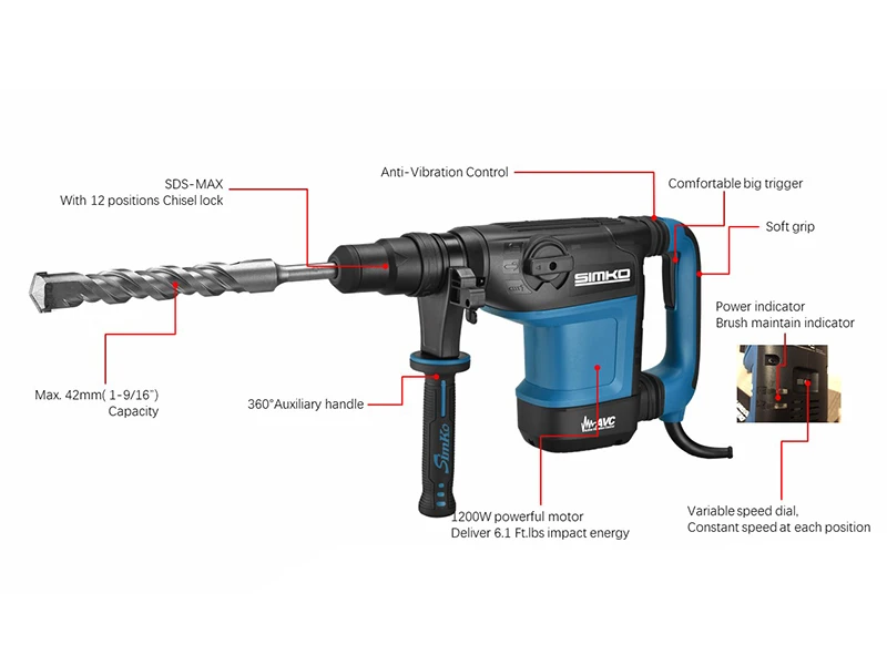 ● Molette de réglage à 6 niveaux et contrôle de vitesse constant pour un réglage variable de la vitesse et de la fréquence de frappe, pour des performances optimales.
