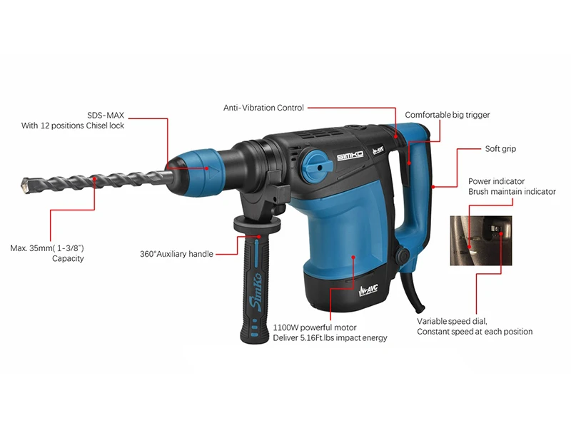 ● Deux modes de réglage : perçage rotatif et percussion uniquement, avec position de repos.