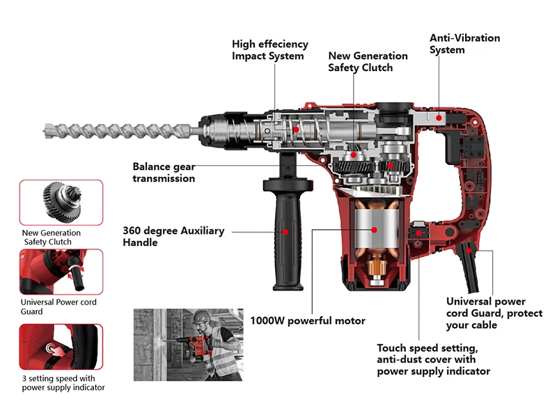 ● Deux modes de réglage : perçage rotatif et percussion uniquement.